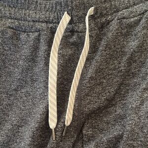 Vuori performance jogger in charcoal gray color with a light gray stripe on either leg. Drawstring and side pockets with soft material.