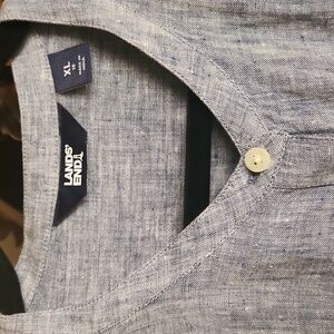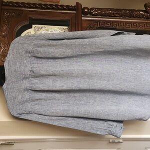 NWOT, Lands' End, Women's Bluish Gray Linen Button Down Tunic Shirt/Dress, Like New!!! This shirt can be worn as a shirt or dress, has side pockets, long sleeves, front pocket,Great with leggings, SZ XL