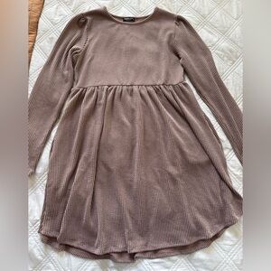 HEIMISH Chocolate Long Sleeve Solid Urban Ribbed Babydoll Mini Dress w/Pockets