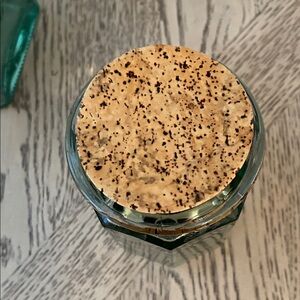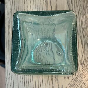 Vintage Green glass jars with cork lids. One is square shaped, 5 1/2” tall x 4 1/2” square . Second is octagon shape: 5 1/2” tall x 4” round. Perfect for storage or decor.