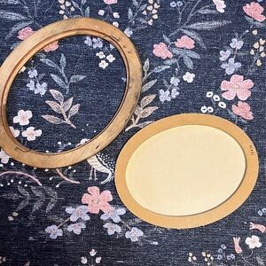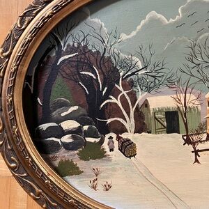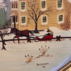 Charming winter landscape painting in an ornate oval frame. Features a snowy scene with a house and trees. It’s signed Ann Lampier. I believe it is acrylic paint. The canvas has come loose from the frame but there is no damage. Just needs to be hammered back in. See photos.