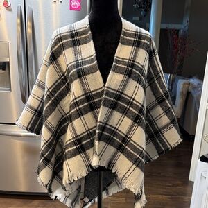 Stylish plaid cape. Features black and white pattern. Fringed edges for added flair. Perfect for layering.