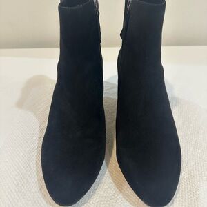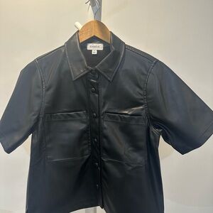 Stylish black puffer vest. Features a hood and button closure. Perfect for layering.