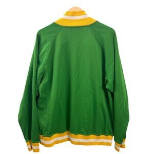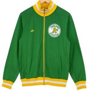 Rare Nike Team Sports Cooperstown Collection Oakland Athletics full-zip jacket in classic green and gold. Features a large embroidered A’s patch, striped ribbed collar/cuffs/hem, and vintage retro styling. Harder-to-find XL size. Perfect for collectors, MLB fans, vintage streetwear lovers, or anyone looking for a true throwback Athletics piece.