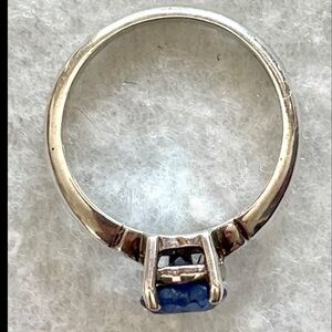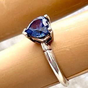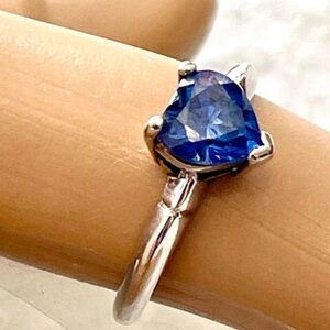 A wonderful Ring that is truly a beautiful piece of jewelry! It has a lustrous blue heart shaped sapphire as the main stone. The Sapphire is facet cut which allows in more light for sparkle. This ring is stamped 925 sterling silver, and is made in Thailand. Size 5.3/4 - Excellent Condition.