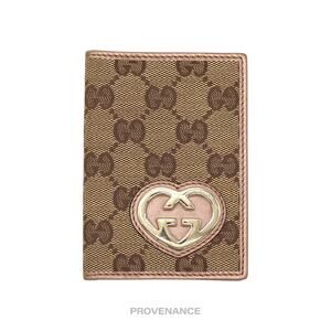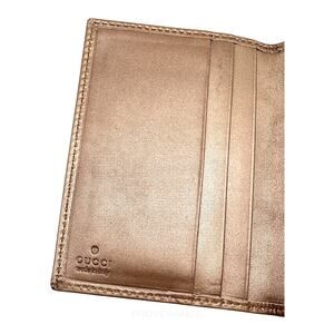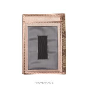 Elegant Gucci wallet with iconic logo pattern. Features brown canvas and gold accents. Compact and stylish design.