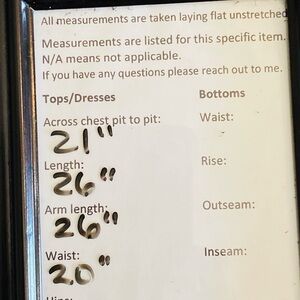 21" pit to pit, 26" length, 26" arm length, 20" waist