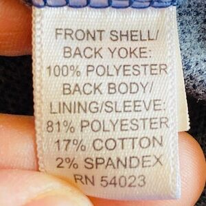 - 81% polyester, 17% cotton, 2% spandex