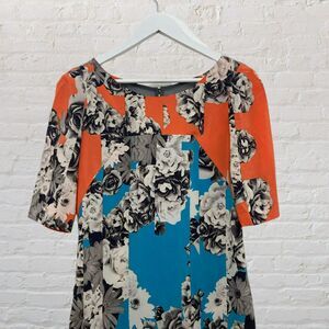 ✨ YOANA BARASCHI for Anthropologie Designer Floral Midi Dress - Statement Piece!Stunning shift dress featuring vibrant colorblock floral print in blue, orange, lime & taupe. This sophisticated midi combines artistic design with luxurious silky polyester for effortless elegance.🌟 DETAILS: