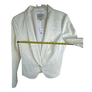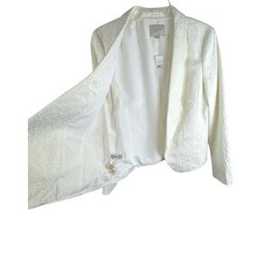 Keywords: LOFT, Ann Taylor, white blazer, jacquard, shawl collar, women's jacket, evening wear, business casual, cocktail attire, elegant, sophisticated, textured, cropped blazer