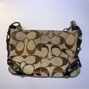 Coach Signature Canvas Shoulder Bag with Black Leather Trim & Brass Hardware