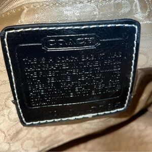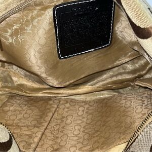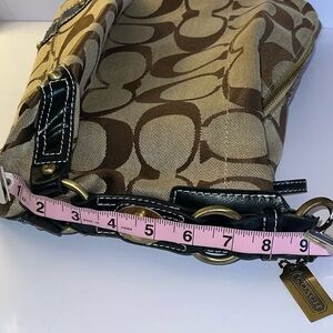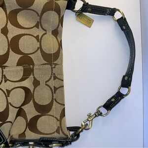 Authentic Coach Signature Shoulder Bag in classic brown and tan jacquard canvas with black leather accents and brass hardware. This stylish and durable bag is perfect for everyday use or as a chic accessory for any occasion.