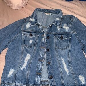 Stylish distressed blue denim jacket. Features button closure and classic design. Never worn
