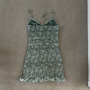 Chic mini dress with a green and white pattern. Features a fitted silhouette and ruffled hem.