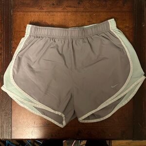 Nike athletic shorts with a sleek gray design. Features mint accents for a fresh look. Ideal for running and workouts.