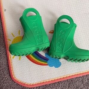 Bright green boots for rainy adventures. Easy to slip on. Durable and waterproof. Size 6c. Can be for girl or boy!