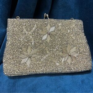 This is a stunning vintage beaded evening clutch, perfect for special occasions. The intricate design and shimmering silver color add a touch of elegance to any outfit.
