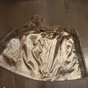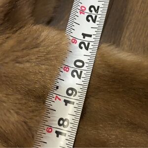 This Vintage Mincara By Russel Taylor Women's Tan Faux Fur Long Coat measures in size M/L is a classic and stylish outerwear option for the winter and fall seasons. The coat features a button closure, a collared neckline, and is lined for added warmth. With its faux fur outer shell and timeless design, this coat is perfect for casual occasions and outdoor settings. Professional cleaning will help maintain the quality of this vintage gem. There is no size listed on coat. The measurements are: