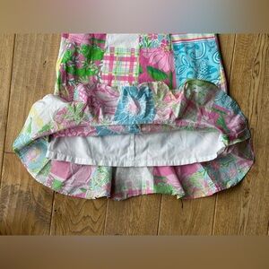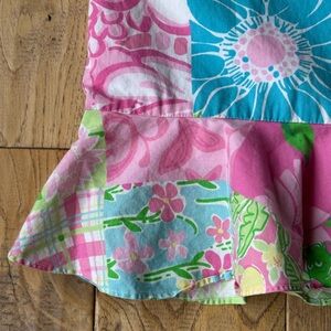 Vintage dress from Lilly Pulitzer. Girls size 10. White tag. Patchwork print in pink, green, blue, white and yellow. Tie spaghetti straps. Ruffle hem. Side zipper closure. Smocked in the back. Lined. Good used condition.