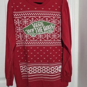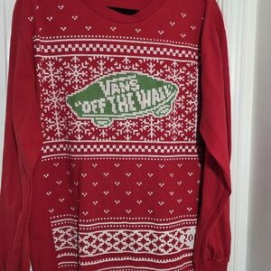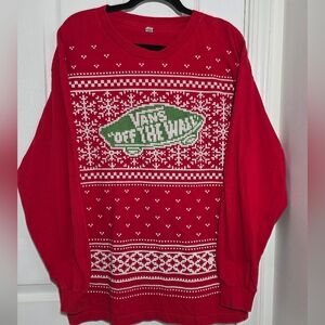 Vans Red Long Sleeve Holiday TShirt with Green and White Pattern Large