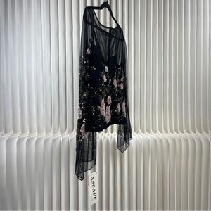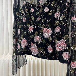 Elegant black mesh top with beautiful pink floral embroidery. Perfect for a night out or special occasion. There is some boning on the interior to create a form-fitting silhouette.