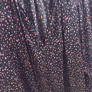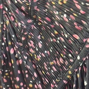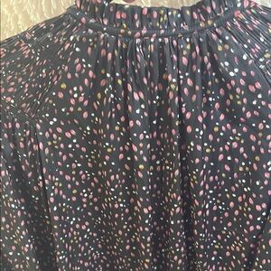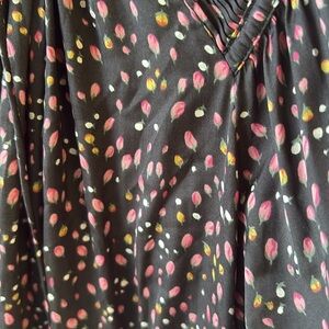 This elegant blouse by Ulla Johnson features a relaxed fit with stylish pleats, crafted in a sophisticated gray shade. The mandarin collar adds a touch of refinement, making it perfect for both casual and formal occasions. Its lightweight fabric ensures comfort and effortless style throughout the day. Pink tulip print on a beautiful charcoal grey silky fabric Elegant smocked cuffs Pit to pit 20” Total length 24”