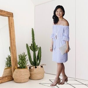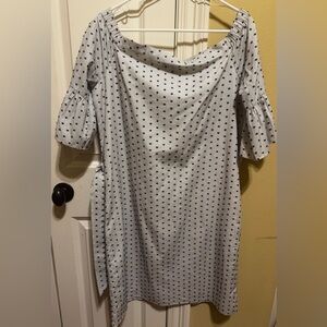 Banana Republic Swiss Dot Off Shoulder Dress Navy Blue Dots Belt Sz M Tall