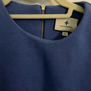 Elegant blue midi dress by Tuckernuck. Features black and white pocket accents. Perfect for any occasion.