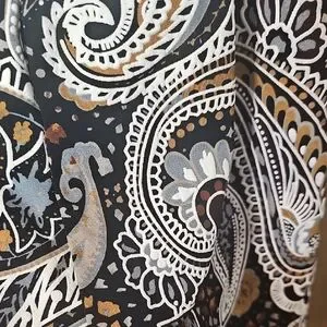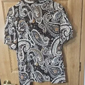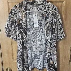 Elevate your wardrobe with this elegant paisley blouse. Featuring a sophisticated blend of black, white, and brown, this top is perfect for any occasion. Pair it with your favorite jeans or skirt for a chic look.