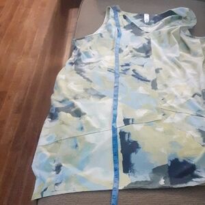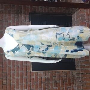 Chic sleeveless with abstract design and side pockets Features blue and green hues.
