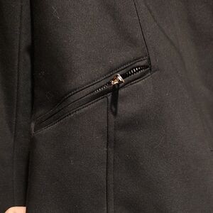 Elegant black blazer with unique zip-front design. Perfect for professional or casual wear.