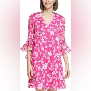 Calvin Klein floral-print ruffled-sleeve shift dress in hibiscus size 6