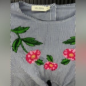 Women’s Velzera Blue Striped Floral Long Sleeve Cotton Blouse Designer Small
