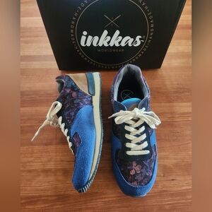 Vibrant sneakers by Inkkas with a floral pattern. Features blue and purple hues. Cream laces add contrast.