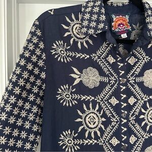 Johnny Was Linen Embroidered Floral Button Down Midi Dress