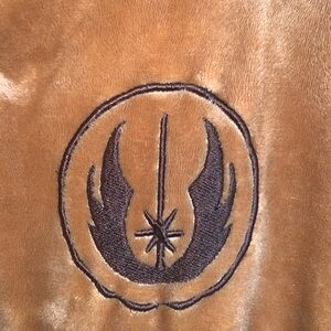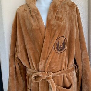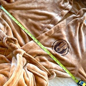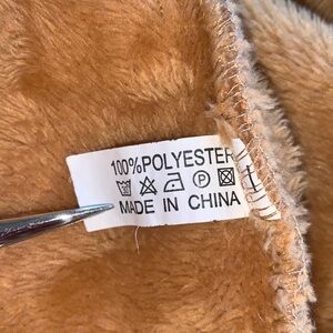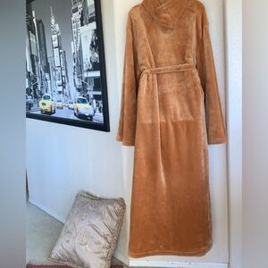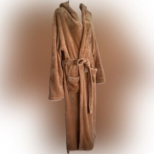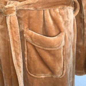 COZY PLUSH ROBE, no brand, in a yummy warm butterscotch tones, with an embroidered crest, belt, pockets & wide regal bell sleeves. Long. Super warm & soft. Fabric 100% Polyester