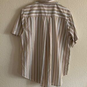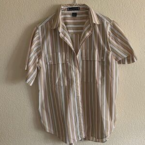 Discover elegance with this chic striped button down shirt. The cream and brown hues offer a versatile look for any occasion.
