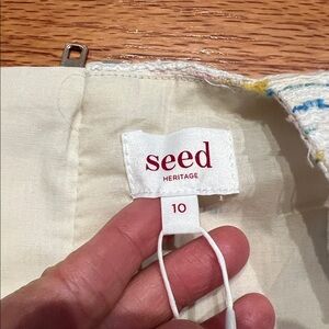 Stylish rainbow (pink, blue, green) weave ivory tweed two-piece set with a matching chain bag. Features colorful speckles on an ivory base. New with tags. Size 10. Seed Heritage brand. Fully lined. Silver Zipper closures on the back of each piece.