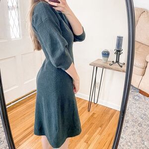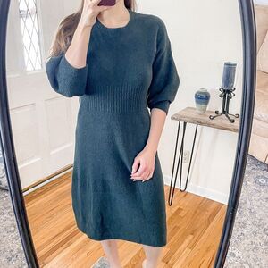Features 3/4 length sleeves, crew neck, A-line style, ribbed cuffs and hems, ribbed fitted high waist, puff sleeves, soft textured fabric, knee length, unlined, dark green, material tag has been removed- 65%cotton, 17% polyamid, 10% acrylic, 7% wool, 1% elastane