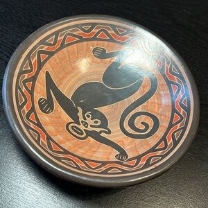 Artisan Costa Rica Guaital pottery hanging monkey design tri-footed pottery bowl