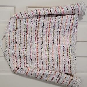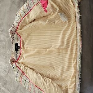 textured tweed cropped blazer with hook and eye closure. multi color. rounded neckline. has pockets. lined. great pre-owned condition. measurements in pics.