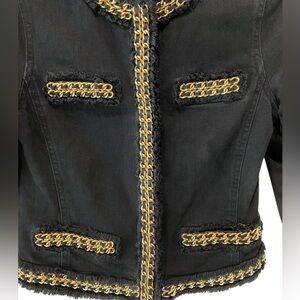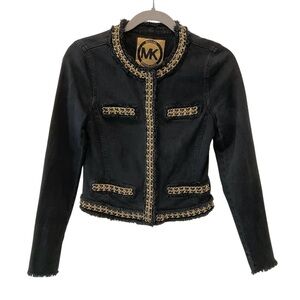Michael Kors Women’s 0 Black Cropped Denim Jacket Gold Chain Trim Runway Chic