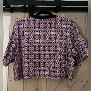 Worn once; boxy oversized crop tee. Lavender with black trim and black emblem throughout. White screen print logo on the front. 100% cotton. BIN18