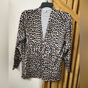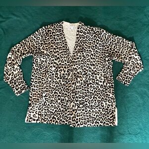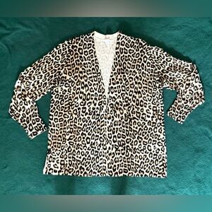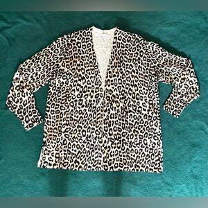 Classic , soft, comfy , elegant CHICO’S buttonless cardigan in preloved condition. Great to wear over solid color top to brighten up outfit. You can also get cute pins for closure ,huge variety of them online .