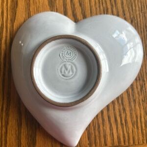 Elegant heart-shaped dish with a textured surface. Also comes with a metal heart shaped arrow serving spoon. Perfect for decor or serving small items.
