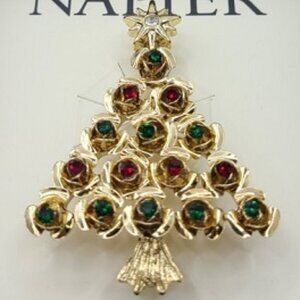 ONLY **2** LEFT!!! NEW (No Tag)! NAPIER Retro Holiday Christmas Tree Gold Red/Green Crystals + a Star Brooch Pin**This Brooch has such a Retro Design...It's Fabulous! Gold Christmas Tree has Red & Green Crystals meant to be Ornaments! On top of the Tree is the Signature Star Tree Topper with a Clear Crystal in the middle! Embrace the Magic of Christmas with this Brooch!**Brooch is 2.25" Tall X 1.75" Wide**NEW (No Tag)