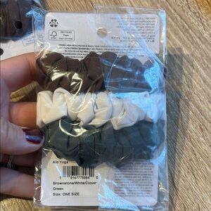 Stylish ALO Yoga scrunchie set in brown, white, and green. Ideal for any hair type.