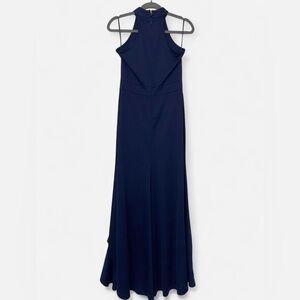 Navy Blue Sleeveless High Neck Ruffled Evening Gown