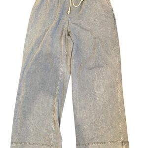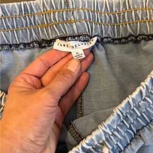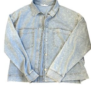 Jane + Delancey lounge set size XL Light blue Looks like denim Soft Wide leg Button up top Collared Drawstring waist Pants: Inseam 28” Rise 13” All measurements are approximate Top: Pit to pit 24” Shoulder to hem 21” All measurements are approximate 82% cotton 14% polyester 4% spandex Bought and wore it twice. No flaws