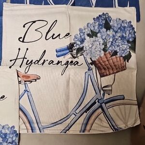 Set of decorative pillow covers featuring floral and text designs. Includes blue and cream colors with hydrangea motifs.